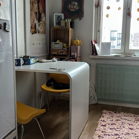 Annetaan valkoinen ruokapöytä ja siihen jatkopala. Pöytää korjailtu moneen kertaan ja ruuvattu sieltä ja täältä. Heiluva ja natiseva. Jos jatkopalaa haluaa käyttää, sen kiinnitys vaatii myös korjausta. Itse olen käyttänyt ilman.