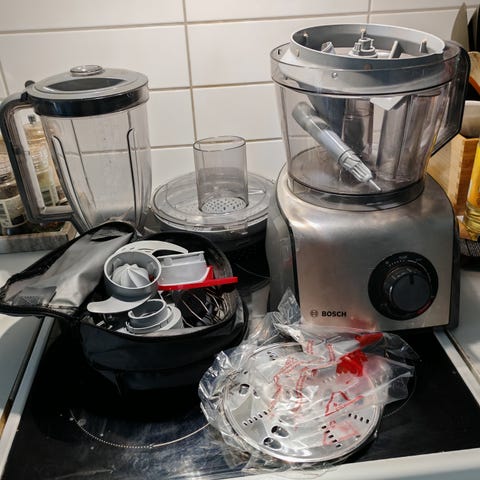 Bosch monitoimikone, jossa useita erilaisia osia ja teräskulho.