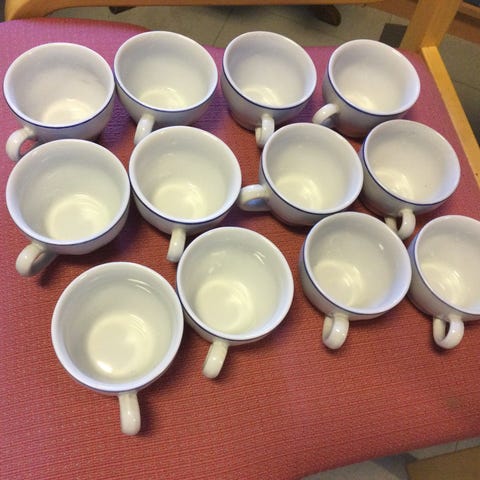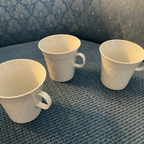 Kolme Arabian kahvikuppia. Pohjapuolella jotain sanomissa, ja kahdessa kupissa sisäpohjassa mikroskooppisia mustia pisteitä, lie valuvika, korostuvat kuvissa. Lempäälä. Yhteishinta.