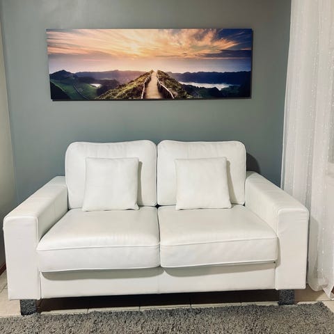 Kahden hengen keinonahkasohva. Istuin- ja selkätyynyt kiinteät. Hyvä istua ja melko kevyt myös kantaa. Ei näkyviä kulumia missään.