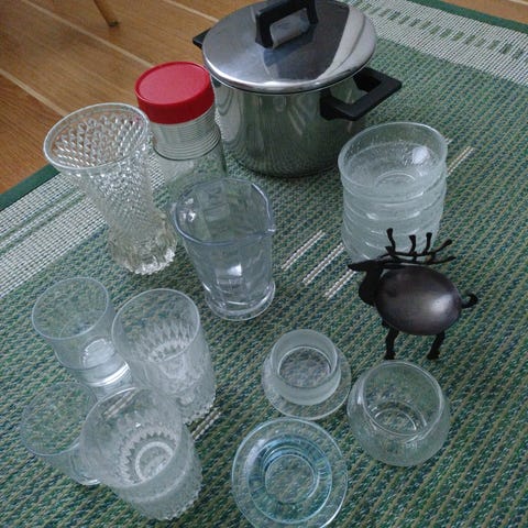 Riihimäenlasin ilvespurkki jossa kansi ja vasemman puoleinen on samaa sarjaa ilman kantta ja oikean puolen on kans todennäköisesti samaa ja ilman kantta.