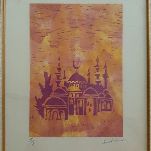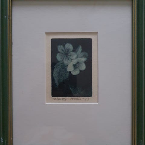 Grafiikanlehti, kehystetty kissa-aiheinen vedos. Pieni neliönmuotoinen kuva esittää mustaa kissaa lepäämässä penkillä, taustalla kukkia ja rakennelmia. Vedos on signeerattu ja nimikoitu “Sleepy”. Teos on paspioitu vaalealla passepartout’lla ja kultasävyisellä kehyksellä. Takana on tuki pöydälle asettamista varten sekä ripustuslenkki seinälle kiinnittämistä varten.