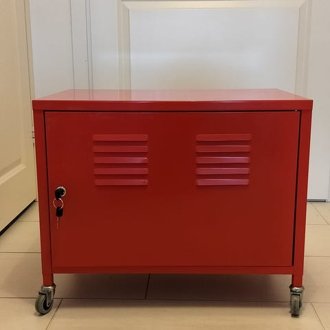 Väri tummanvihreä. Ulkopuolelta hyväkuntoinen, sisällä hyllyissä pieniä naarmuja