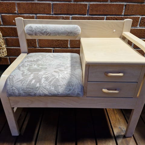 Puhelinpöytä ja penkki. Hyvässä kunnossa. Pientä kulumaa, näkyy kuvissa.
