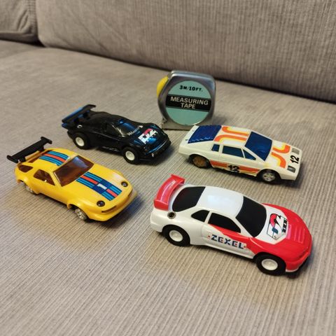 -Pienempi vanha autorata (80-luvulta). Kaikki osat tallessa. Toimivuudesta ei takeita. Pattereilla toimiva ja patterit laitetaan suoraan ohjaimeen. Toimii isoilla sormi paristoilla (joita itselle ei nyt ollut). Yhteensopiva isomman radan kanssa.