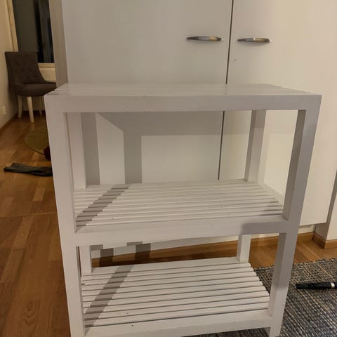 Erinomaisessa kunnossa oleva ASKO BASIL -hyllystö. Musta metallirunko ja kuusi puuhyllyä. Muutama pieni ruuvi puuttuu, joiden olisi tarkoitus kiinnittää hyllyt runkoon, mutta ne eivät ole tarpeellisia – hyllyt pysyvät paikallaan oman painonsa ansiosta.
