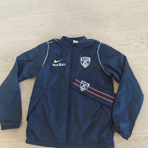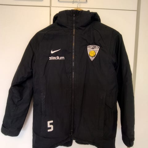 Jako lasten jalkapallotakki, koko 40. Sininen, hupullinen toppatakki, jossa edessä vetoketju ja seuran sekä numeromerkinnät. Takki sopii jalkapalloharjoituksiin ja muuhun ulkoiluun viileällä säällä. Hoito-ohjeiden mukaan pestään samansävyisten kanssa, kaikki sulkimet suljettuna, ilman huuhteluainetta ja merkintöjä silittämättä.