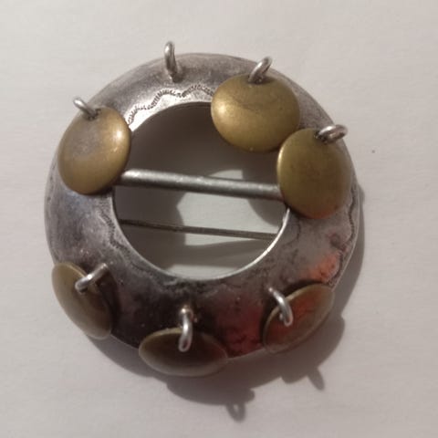 Kaunis hopeoitu pronssi Lapin risku-rintaneula 7 kullatulla laukalla. Tekstit Bronze ja Finland löytyy korun takaa. Hieman patinoitunut. Alkuperäisessä rasiassa.