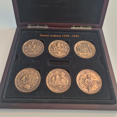 Mitalikokoelma, johon kuuluu useita suomalaisia mitaleja eri nauhoilla sekä muutamia kolikoita. Yhdessä mitalissa teksti ”Isänmaa 1941–1945” sinivalkoisella nauhalla, toisessa mitalissa teksti ”Urheudesta för tapperhet” puna-keltaisella nauhalla. Kolmantena tumma mitali musta-punaisella nauhalla. Lisäksi mukana on suomalaisia kolikoita, muun muassa kaksivärinen 10 markan kolikko sekä pienempiä kolikoita. Sopii esimerkiksi keräilyyn tai numismatiikasta ja kunniamerkeistä kiinnostuneelle. Huomioithan, että tarkat vuosiluvut, metallilaadut ja arvot eivät käy ilmi kuvista ja ne on hyvä tarkistaa paikan päällä.