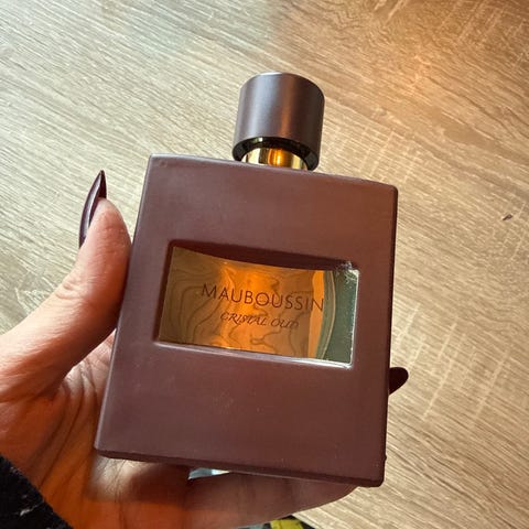 Mauboussin Cristal Oud hajuvesi. Tuoksu on pakattu ruskeaan, neliönmuotoiseen pulloon, jossa on kultainen etikettilaatta ja pyöreä korkki. Soveltuu päivittäiseen käyttöön tai juhlatilaisuuksiin mieltymysten mukaan.