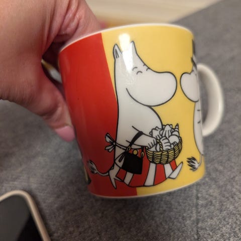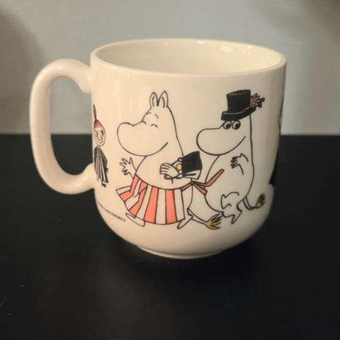 Lasten muumimuki iloinen perhe. Muki uudenveroisessa kunnossa. Mukia valmistettu vuosina 1995 - 2007.