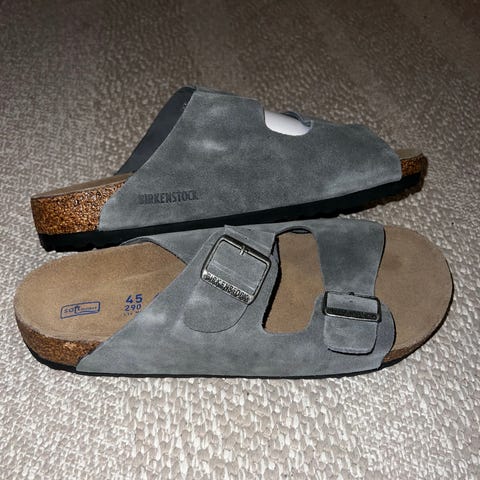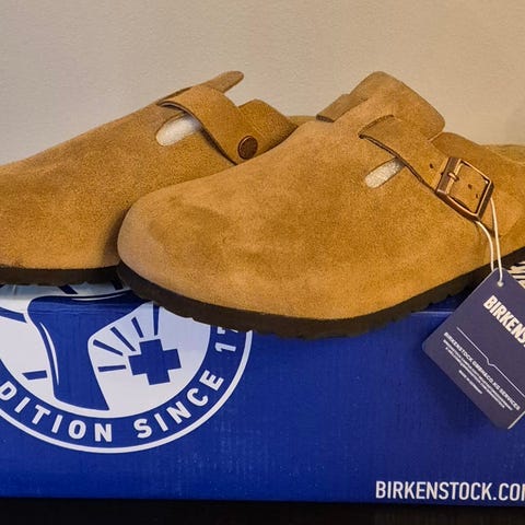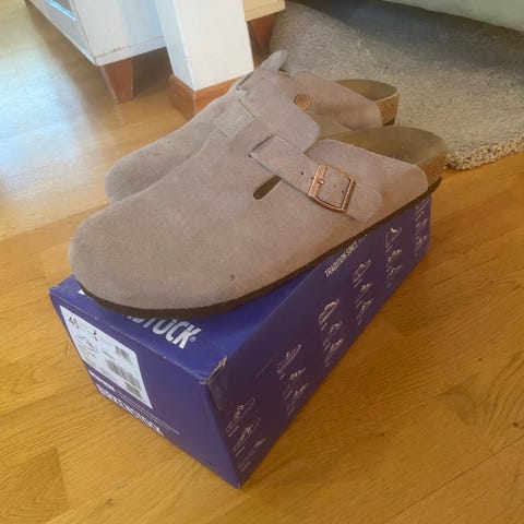Birkenstock Boston kengät, koko 44. Malli on umpikärkinen pistokas, jossa on säädettävä remmi päällä. Päällinen on ruskeaa mokkanahkaa ja sisäpohja muotoiltua korkkia ja nahkaa. Vain kokeiltu jalkaan.