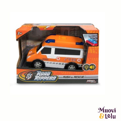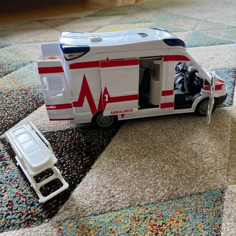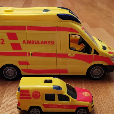 Avautuva leluambulanssa, jossa mukana pienet paarit. Omat lapset vetänyt narulla, pyörät siis liikkuu.