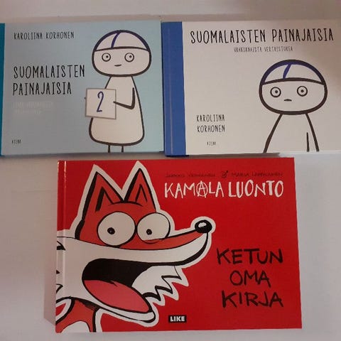 Suomalaisten Painajaisia kirjat, osat 1. Vähäsanaista vertaistukea ja 2. Lisää vähäsanaista vertaistukea. Karoliina Korhonen. Muutamia kertoja luettu. Hyvä kunto. Hinta yhteensä 15€.