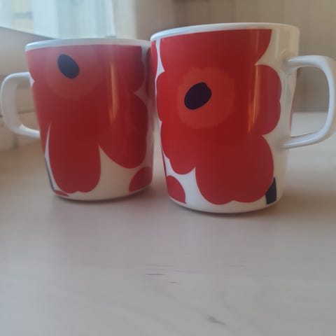 Hyvin pienet viat kuvissa: kahdessa pieni musta jälki, yhdessä pieni valkea piste lasitteessa. Muutoin siistit ja ehjät. Sisäpuolella ei naarmuja tms.