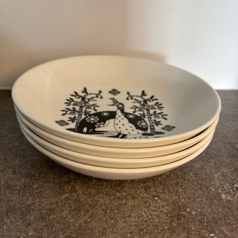 Iittala lautanen 6kpl, valkoinen posliini, jossa musta koristekuvio. Pieni matala lautanen sopii esimerkiksi jälkiruoille, alkupaloille tai tarjoiluun. Lautasen pohjassa Iittala-logo.