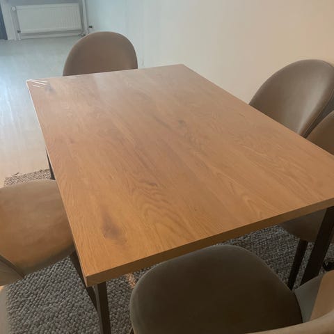Hyvässä kunnossa oleva ruokapöytä. Pöytälevyssä ei mitään naarmuja, vain yksi kulmista hiukan repsuttaa mutta teipattuna ei huomattavissa, ks. Kuva.