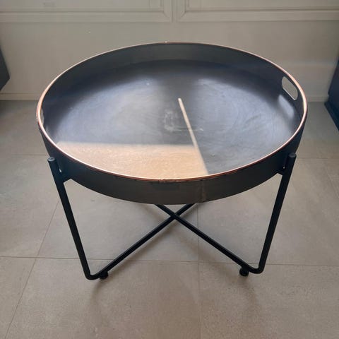 Ellos homesta kaksi vuotta sitten ostettu musta pyöreä sohvapöytä. Yleisilme siisti ja hyväkuntoinen. Perus käytönjälkiä näkyy. Reunoista muutamasta erittäin pienestä kohdasta irronnut hieman maalia, näkyy kuvassa. Saa maalattua siististi piiloon. Ovh 159,99€. Irroitettavat jalat.
