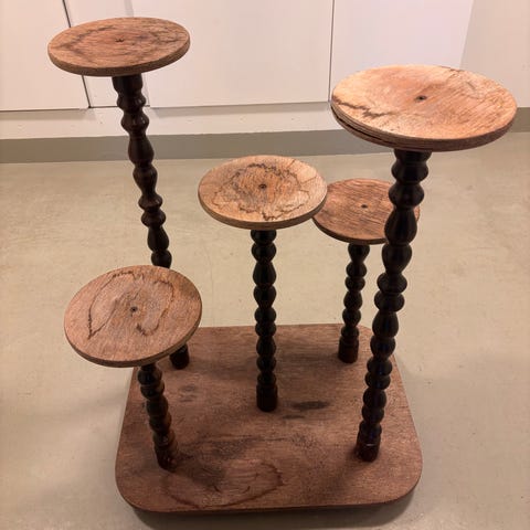 Vanha, antiikkinen kukkataso / sivupöytä. Tumman ruskea jossa vihreä keskusta tasoilla. Korkeus 68,5cm ja halkaisija 39cm. Kulumaa on vähän joka puolella mutta onhan tämä nyt hieno!