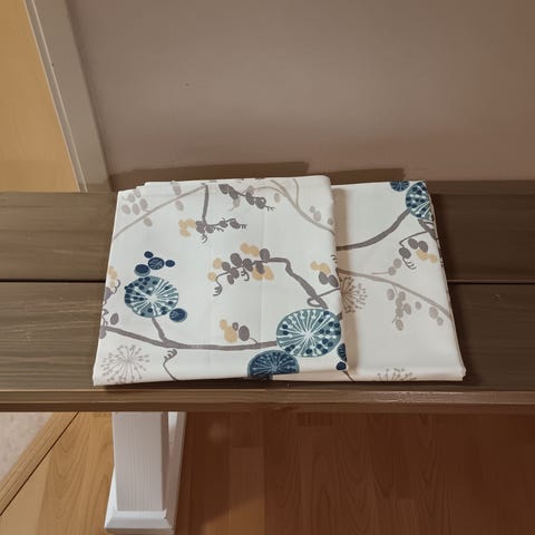 Finlayson kappaverhot (2 kpl) mustavalkoisella pampula-kuosilla. Materiaali 100 % puuvillaa. Yläreunassa rypytysnauha ripustusta ja leveyden säätöä varten. Koko 52 cm x 245cm.
