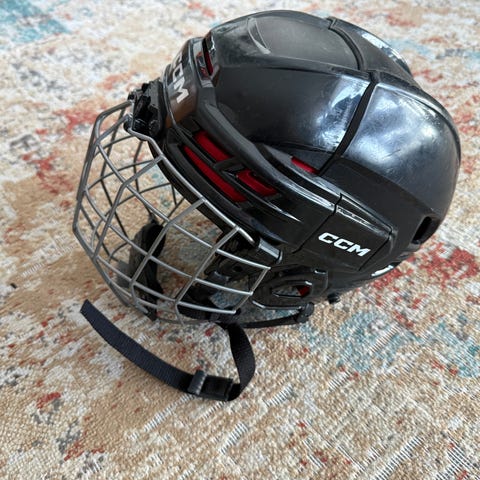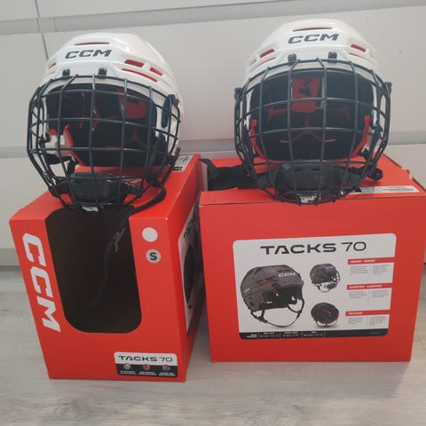 CCM Tacks 70 JR jääkiekkokypärä junioreille. Kypärässä on metallinen ristikkokasvosuoja ja säädettävät remmit. Koko 52,5–57 cm (6 5/8–7 1/4), sopii tyypillisesti noin 7–10‑vuotiaille pelaajille. Hyvässä kunnossa. Sovitusmahdollisuus. En lähetä.