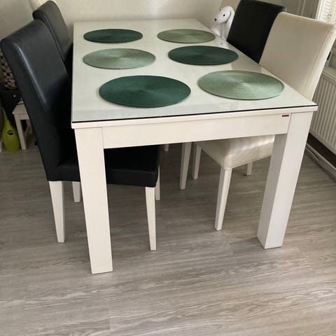 Myydään muuton tieltä Maskusta ostettu 95x180cm ruokapöytä jossa valkoinen maitolasi päällä (irroitettava, suojannut pöydän pintaa uudesta saakka) sekä 6 vaökoista tuolia harmaalla kankaisella istuinosalla. Tuolien pinnat kaipaavat pesua (en ehdi muuton alla niitä nyt pestä). Muuten ryhmä siistissä kunnossa ja ehjät.