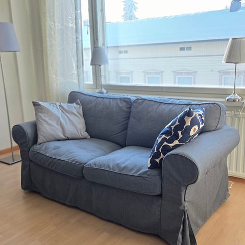 Ikean Ektorp sohva, 3:n istuttava. Tummanharmaa. Kunto hyvä, painaumaa tyynyissä. Ehjä runko ja kangas.