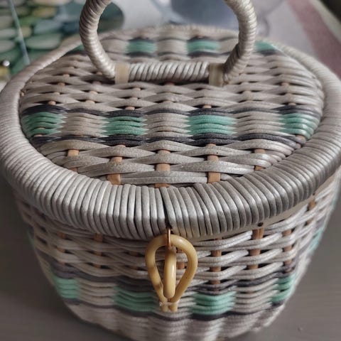 Kunnossa oleva tilava kuusilokeroinen ompelurasia 1980-luvulta.