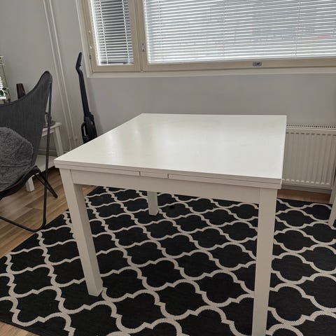 Valkoinen ruokapöytä johon mahtuu hyvin paikat kuudelle hengelle. Pöydän pituus on 200 cm ja leveys 90 cm. Kunnoltaan pöydästä löytyy moitteita sillä jonkun verran pöytälevyssä on kulumaa eri kohdissa (katsothan lähikuvista). Muutoin pöytä on oikein hyvä ja tukeva käyttää. Noutaa voi Turusta Hirvensalosta.
