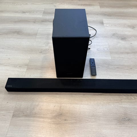 Samsung soundbar ja erillinen subwoofer kotikäyttöön. Soundbar on musta ja sijoitettu television eteen, subwoofer erikseen lattialle. Sopii television äänen parantamiseen olohuoneessa tai muussa katselutilassa. Tarkempia teknisiä tietoja, kuten mallinumeroa tai liitäntöjä, ei ole ilmoitettu.
