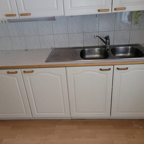 Keittiökalusteet 1990 vuoden kerrostaloasunnosta. Sisältää kuvissa näkyvät kaapit ja lipastot.