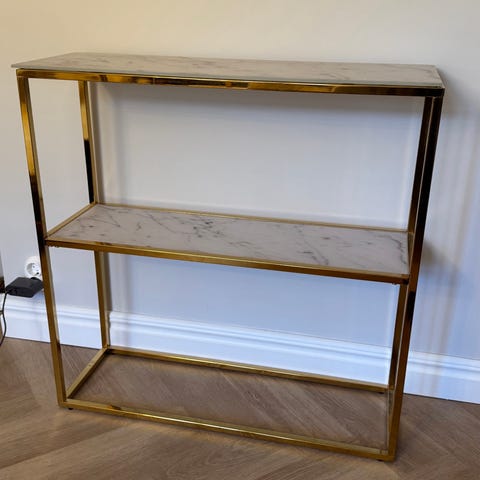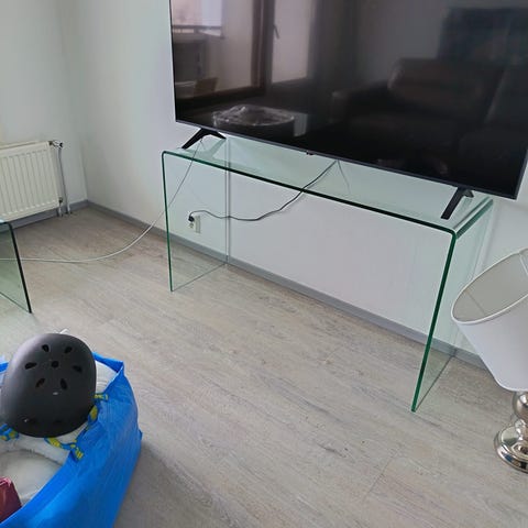 Valkoinen lasinen konsolipöytä, jossa on metallinen runko ja lasinen pöytätaso. Pöydässä on yksi laatikko säilytystä varten. Sopii esimerkiksi eteiseen, olohuoneeseen tai makuuhuoneeseen sivu- tai meikkipöydäksi. Pöytä on kapea ja kevytrakenteinen, joten se mahtuu hyvin myös pienempiin tiloihin.kelmulla pakattu lasinen osio.hyvässä kunnossa