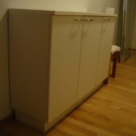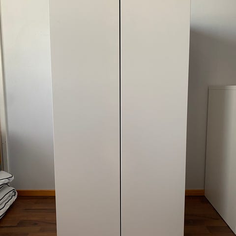 Valkoinen kaappi, ovi on kiiltävän valkoinen. Kaappi kulkeutuu tarvittaessa Orimattilasta Malmille