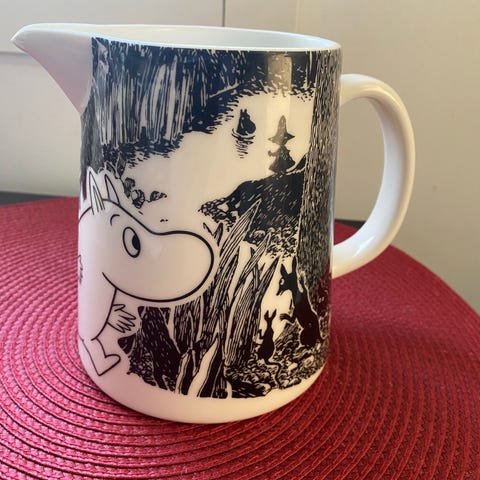 Arabia Muumi -sarjan kannu ja muki. Astioissa on Muumi-aiheinen kuvitus, jossa hahmot on kuvattu metsämiljöössä auringonlaskun taustalla. Materiaali on lasitettu keramiikka/posliini. Sopii esimerkiksi kahvi- tai teeastioiksi sekä kattaukseen ja koristekäyttöön. Pohjassa on Arabia Finland -leima ja Muumi-hahmon kuva.