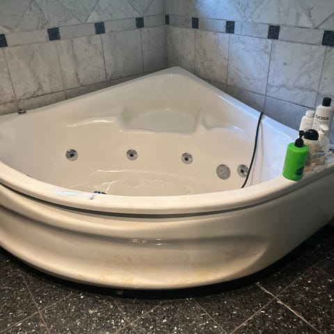 Valkoinen tu yfords -poreamme, jossa useita suuttimia ja ergonominen muotoilu. Oireet pohjassa ja sivusta. Ammeeseen kuuluu Oras hana.
