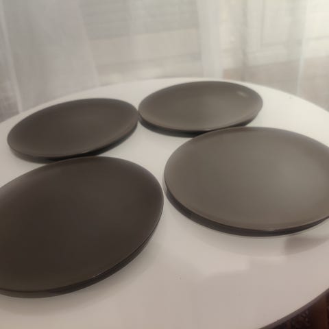 Käytetyt mustat Ikean lautaset. Ruokalautasia 4kpl, halkaisija 27cm. Keittolautasia 6kpl, halkaisija 19cm.