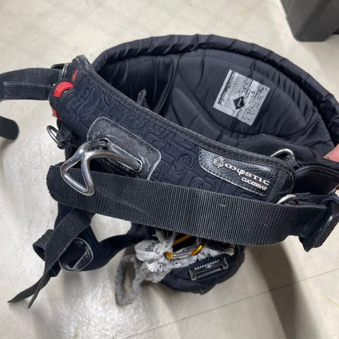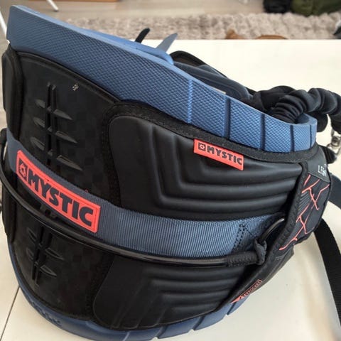 Mystic Warrior -vyötärötrapetsi leijalautailuun. Trapetsi on musta, ja siinä on selkää tukeva pehmustettu rakenne. Edessä on metallinen koukku ja vahva remmikiinnitys, sivuilla D-renkaat lisävarusteiden kiinnitystä varten. Sisäpuolella on muotoillut pehmusteet, jotka jakavat vedon tasaisesti vyötärölle. Soveltuu käytettäväksi leijalautailussa ja muissa vetolajeissa, joissa tarvitaan vyötärötrapetsia.