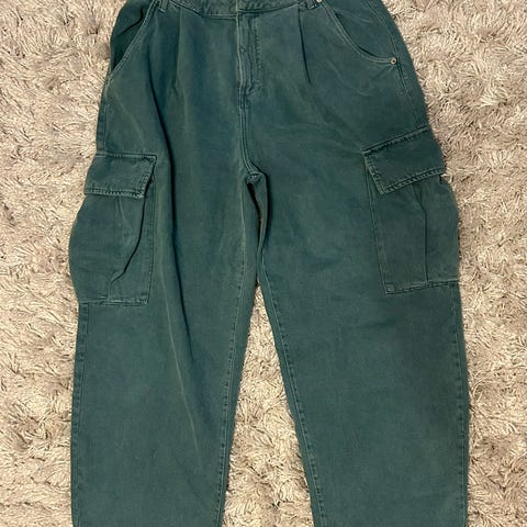 Musta työ-/cargo-housut, koko C40 (vyötärö noin 92 cm, lahkeen sisäpituus noin 74 cm). Materiaali 60 % puuvillaa ja 40 % polyesteriä.