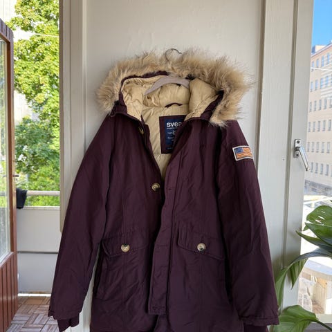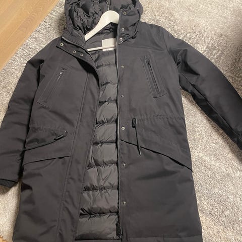 Samsøe Samsøe -parkatakki. Päällinen matta polyesteri, sisältä muhkea untuva/höyhen täyte. Todella lämmin. Pikimusta, kuvissa päivänvalo haalistaa. Pitkähkö malli, jossa vetoketjukiinnitys ja tuulisuoja edessä. Nauhat hupussa sekä neljä taskua edessä. Nauhat vyötäröllä sekä leveät resorit hihansuissa. Lämpöasteikko 4/5. Valmistettu 58 % polyesteristam 25 % puuvillasta, 11 % polyuretaanista ja 6 % nylonista. Toppaus 50 % untuvaa ja 50 % höyheniä.