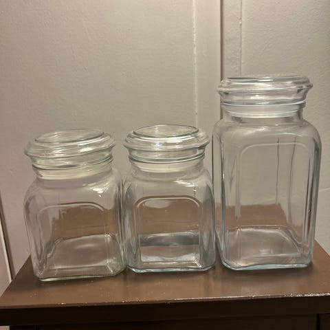 Myydään kaksi Riihimäen lasin Kantti-lasipurkkia. Purkin korkeus kannen kanssa 10,5 cm. Toisen purkin sävy taittaa hieman vihreään. Hinta yhteensä 10 €.