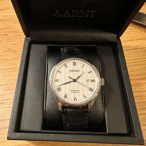 Valmistettu JapanissaMalli: Seiko Presage SRP852J1, valkoinen kellotaulu, automaattikello.Materiaali: ruostumaton teräs kultaisenaKellotaulun väri: ChampagneKellon kehyksen koko: 34 mm (ilman kruunua)Soveltuvuus: enintään 18,0 cm ranteeseenSeiko 4R35 automaattinen mekanismiVirranvaraus: 40 tuntiaToiminnot Ajanotto, hakkerointi, manuaalinen ja automaattinen vetäminen, pyyhkäisevä sekuntiviisari, päivämääränäyttö—// TOIMITUKSEN SISÄLLÖT //—EiAlkuperäiset asiakirjat: Ei—// EHDOT //—Kotelon kuluma: vähäinen *(kotelossa on hiusnaarmuja.)Kellon takakansi: merkityksetön *(näyttö takakansi)Kuluminen kristallissa: Ei mitään / Mitätöntä *(vain pienet hiusviivat)*Näytön kuluma: Ei mitäänKäytössä käsissä: Ei mitäänBezel-kulumaa: Mitätöntä *(minimaalinen hiusviivoja)Kruunun kuluminen: merkityksetönKuluminen rannekkeessa tai -rannekkeessa (asennus yllä mainittu): Mitätön / vähäinen *(Seiko nahkarannekkeet. Kevyet käytön merkit soljessa)KUNTOARVIOINNIN STANDARDI:Ei mitään (Paras) > Merkityksetön > Pieni > Keskitaso > Raskas > Vaurioitunut (Huonoin)— // KOKONAISARVIO //—ARVIO: A+ARVOSTELUN OHJEN - Uusi, ilman näkyviä käytön merkkejä.Lähellä mint-kuntoa, vähäiset kulumisen merkit.A+ - Erinomaisessa kunnossa, vähän käytetty ja vähän kulumisen merkkejä.A - Hyvässä kunnossa, kevyitä käytön merkkejä tai naarmuja.B+ - Kohtalaisessa kunnossa, jossa on ilmeisiä kulumisen tai naarmujen merkkejä.B - Huonokuntoinen, runsaasti kulumisen merkkejä tai naarmuja.V - yli 20 vuotta vanha ja vintage-kunnossa, jossa on ilmeisiä kulumisen ja naarmujen merkkejä.ND - Pelastustilassa, toimimaton tai huoltoa vaativa. Saattaa puuttua osia.—// Toimitustapa //—PALVELU: FedEx Economy tai vastaava—[[[ Asiakkaille huomautuksia ]]]—Valokuvat- Kaikki valokuvat eivät ole retusoituja (paitsi sarjanumeroiden osalta, jotka on piilotettu turvallisuussyistä). Mahdolliset kuvaamattomat mutta näkyvät viat katsotaan kuvien perusteella kuvailluiksi. Kuva puhuu tuhat sanaa, joten pyydämme teitä katsomaan kuvia huolellisesti ennen tarjouksen tekemistä, sillä ne muodostavat olennaisen osan kuvauksesta. Arvostan asiakassuhdettani, enkä halua olla pettymys, kun tuote saapuu ei-toivottujen tulosten kanssa.tarkkuus- Tarkkuus testataan jokaisessa kellossa vaakasuorassa asennossa (kellotaulu ylöspäin) täysin windatun varaustilan ollessa voimassa, ja sen katsotaan riittäväksi ajan pitämiseksi ennen kuin kellon toimittamme liikkeestämme. Jotkut tekijät, jotka voivat vaikuttaa tarkkuuteen, ovat ranteessa vietetty aika, käsivarren liike ja jousen jännitys. Kellot, jotka ovat yli 10 vuotta vanhoja, saattavat kokea suuremman tarkkuuden vaihtelun ja epätasaisuutta mekaanisen kulumisen vuoksi.Aitous- Kaikki myymäni rannekellot ovat aitoja. Yritän merkitä kaikki jälkimarkkinan osat, jotka pystyn identifioimaan, parhaalla mahdollisella tiedollani. Arvioi kohde kuvien perusteella, sillä ne on otettu todellisesta saamistasi tuotteesta. Kirjallinen kuvaus on apuvälineenä vain silloin, kun kuvat eivät näytä vikaa täydellisesti. (paitsi joillekin täysin uusille kappaleille, joiden kuvat saatetaan lainata aikaisemmista listauksista).[KATSO HOIVAVINKKI]- Kellot eivät ole suositeltavia pidettäväksi suihkussa tai kylvyssä. Kuuma vesi ja saippua voivat vahingoittaa kellon kumitiivisteitä ja aiheuttaa vuotoja. Lisäksi höyry (vesihöyryt) on vähemmän tiheää kuin ve