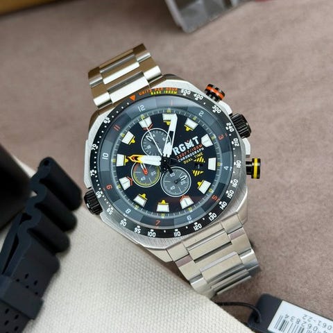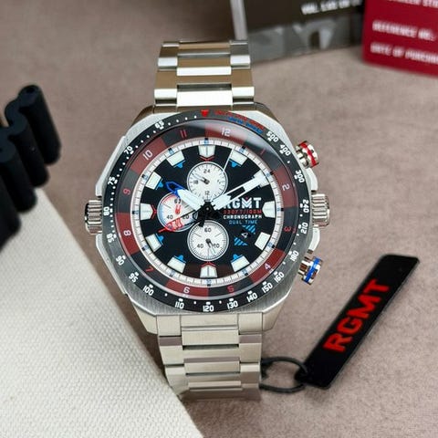 Kaunis miesten kello RGMT:n Capricorn-sarjasta. Viitenumero RG-8061-44. Kellossa on kvartsikoneisto (Miyota - FS16) ja se on ruostumattomasta teräksestä valmistettu. Siinä on helppolukuinen kellotaulu ja kontrastiväriset yksityiskohdat sekä indekseissä että osoittimissa. Kellossa on myös kronografi, kaksoisaikatoiminto ja päivämääränäyttö kello 4:n ja 5:n välillä.Uusi ja käyttämätön!Kello on mukavalla teräksisellä rannekkeella.Kello toimitetaan laatikossa, ulkopakkauksessa, lisäkumirannekkeella ja tyhjillä asiakirjoilla kuten esitetään.Kelloliike: Quartz (Miyota - FS16)halkaisija: noin 44 mm ilman kruunua.dikte: noin 13 mmnauhan leveys: 22 mmKoko nauha: noin 20 cm.Ikä: 2020+Se lähetetään vakuutettuna.Valokuvien ottaminen on osa kuvausta.