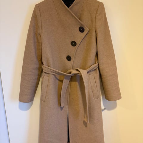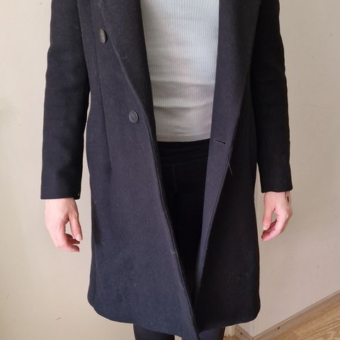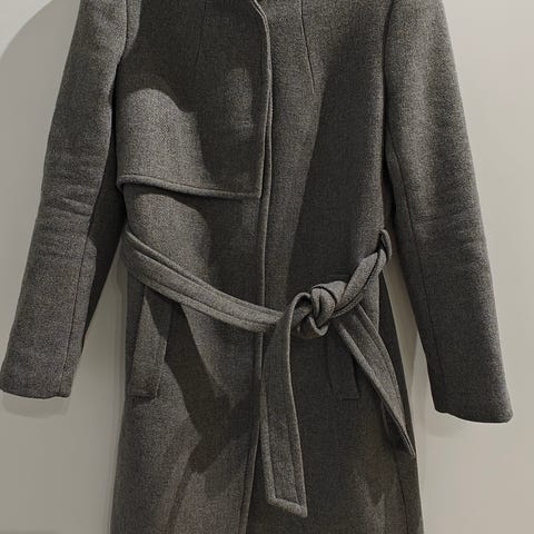 Hyväkuntoinen ja lämmin harmaa villakangastakki, koko S, sisältää 67% villaa. Vetoketjukiinnitys edessä. Malli on polvipituinen, suoralinjainen ja sopii arki- ja kaupunkikäyttöön viileään säähän.🩶