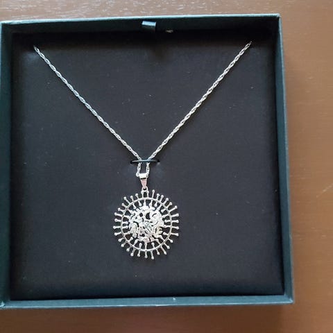 Käyttämätön alkuperäisessä pakkauksessa täysikuu kaulakoru. Suunnittelija Tapio Wirkkala, valmistaja Kultakeskus. 830 hopeaa. Riipuksen halkaisija 50 mm, ketjun pituus noin 44 cm. Postitus 6,90€