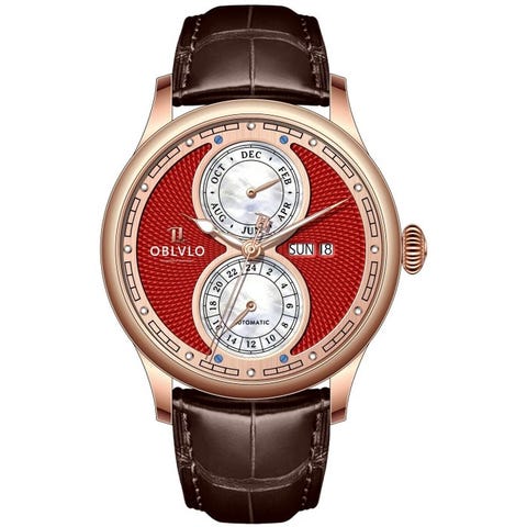 UusiOlemme koruliike, joka myy vain uusia, eksklusiivisia tuotteita. Kaikilla tuotteillamme on täysi virallinen takuu.Erittäin ainutlaatuinen kello Oblvlo-brändiltä, joka perustettiin Pariisissa, Ranskassa vuonna 1982. He ovat tunnettuja erityisistä suunnittelustaan.Erinomainen varaustason osoitin kellotaulun yläreunassa, joka näyttää liikkeessä olevan jäljellä olevan varauksen määrän.materiaalitapa316L-kultainen ruostumaton teräsmateriaalirannekekorkealaatuinen nahkaLiikeAutomaattinen kaksoisavoin sydän, kaks tasapainopyörääMateriaali kristalliVahva safiiriHalkaisijalaatikko46 mmpakettiTäytä laatikkoon kaikki viralliset asiakirjat.Lähetys vakuutuksella ja seurantakoodilla.Kaikki uudet.