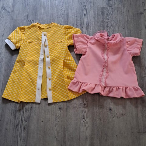 Hyvässä kunnossa olevia. Useissa mekoissa napit takana. Kauniita ja varmasti harvinaisia kuoseja.