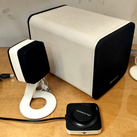2 kpl Audiopro addon 5 aktiivikaiuttimet. 2kpl Audiopro bluethoot lähetin ja vastaanotin. 1 kpl Optinen to aux muunnin tv kytkentää varten. Samaan settiin samsungin kaiuttimet päälle.