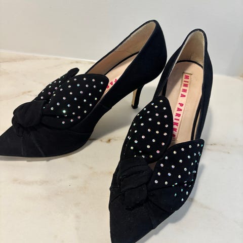 Käyttämättä jääneet Minna Parikan lollipop-sarjan korkokengät/nilkkurit matalalla korolla. Musta kiiltonahkainen pinta, tikkari punainen, varsi valkoinen.