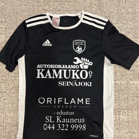 SJK junioreiden treenipaita ja shortsit. Koko suunnilleen 150. Shortsit vaikuttaa olevan pientä kokoa. Printit kuluneet, mutta muuten ehjät. Parhaat päivänsä nähneet, mutta menee vielä treenikäytössä.