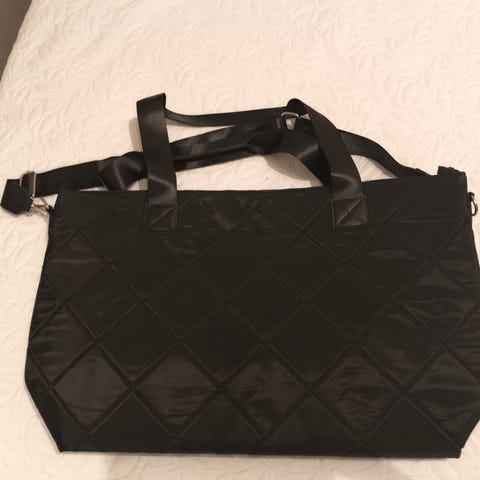 Naisten musta olkalaukku, jossa tikattu pinta ja metallinen ketjuhihna. Laukussa on läppä ja etusoljellinen kiinnitys. Sopii käytettäväksi arjessa tai juhlakäytössä. Materiaali vaikuttaa keinonahalta, tarkka materiaali ei tiedossa.